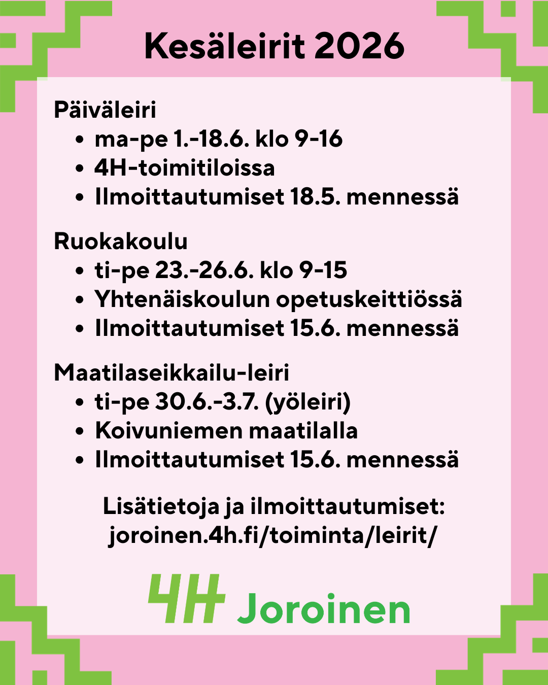 Joroisten 4H:n kesän leirit on nyt julkaistu ja ilmoittautuminen on auki. Leireilemme heti koulujen loputtua viisi viikkoa: - Päiväleirima-pe 1.-18.6. klo…