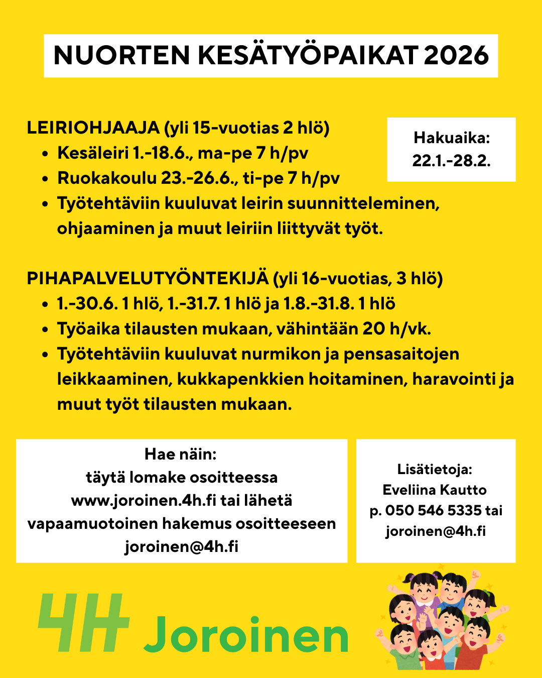 Tarjoamme mahdollisuuksien mukaan kesätöitä 15-28 -vuotiaille nuorille toukokuusta syyskuuhun.